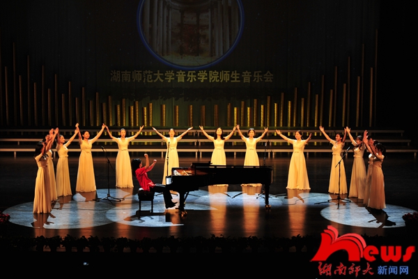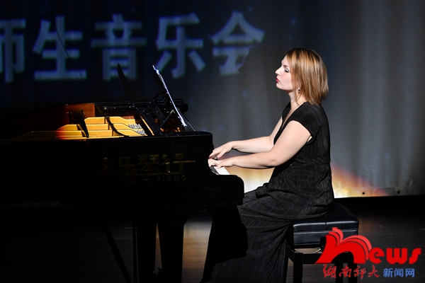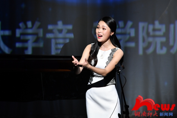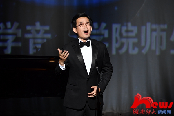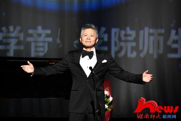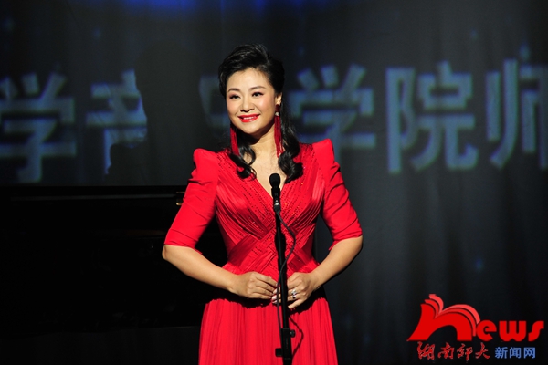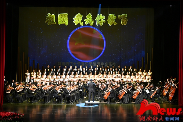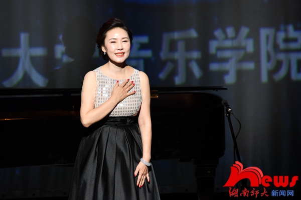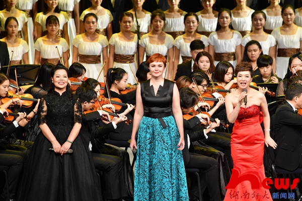 音乐会在我校潇湘爱乐交响乐团演奏、潇湘天籁合唱团演唱的《红旗颂》中拉开序幕。随后,湘籍女高音歌唱家、我校音乐学院客座教授王丽达演唱了湖南民歌《浏阳河》和代表作《亲吻祖国》,用歌声表达了她对祖国和家乡的热爱。由外籍教师塔季扬娜携手音乐学院中外班教师周末带来的双钢琴演奏《黄河》,配合默契,与背景奔流不息的黄河相得益彰。在观众的欢呼声中,“世界年轻一代罗西尼男高音的代表歌手之一”的音乐学院石倚洁教授带来歌剧《微笑王国》中的选段《你是我的一切》和经典曲目《我爱你中国》。