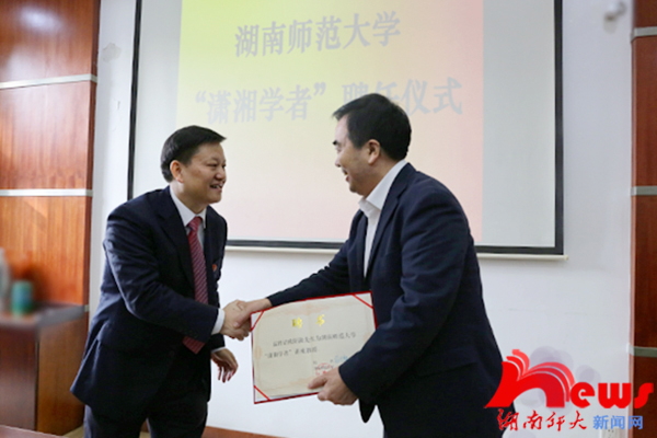 蒋洪新为欧阳淞颁发“潇湘学者”聘书。